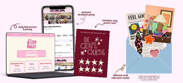 Be the first to peek at next month’s events and secure your spot before anyone else, and snag members-only pricing! PLUS be the first to snag Dilly Dally merch & products!